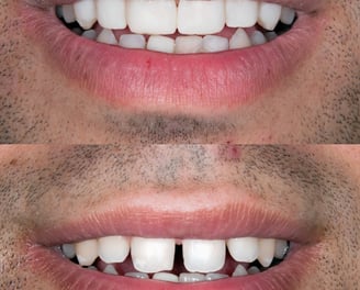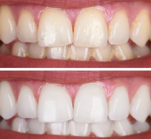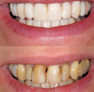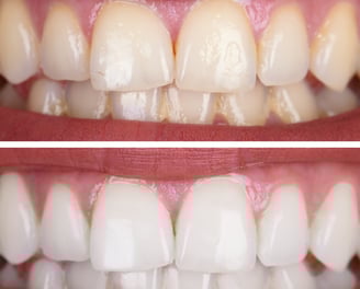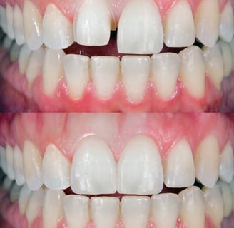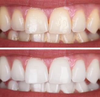 Manchas e escurecimento que afetam a autoestima são resolvidos com procedimentos de clareamento, resultando em dentes mais claros e um sorriso renovado.